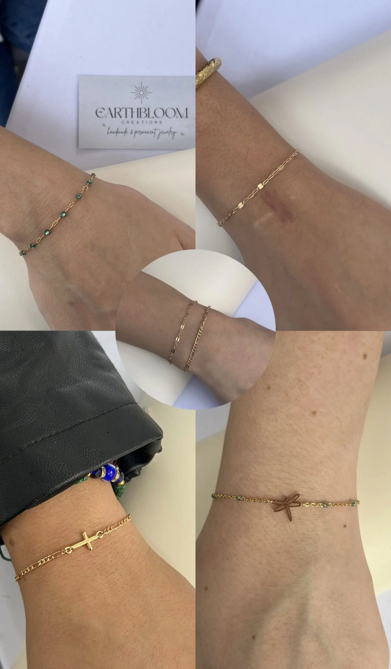 Permanent jewelry is a custom-fitted bracelet, anklet, or necklace that’s welded together instead of using a clasp. Each piece is measured perfectly to you and “zapped” on with a quick, painless spark, creating a seamless piece you can wear every day. It’s the perfect way to celebrate a friendship, milestone, or treat yourself to something special that lasts!